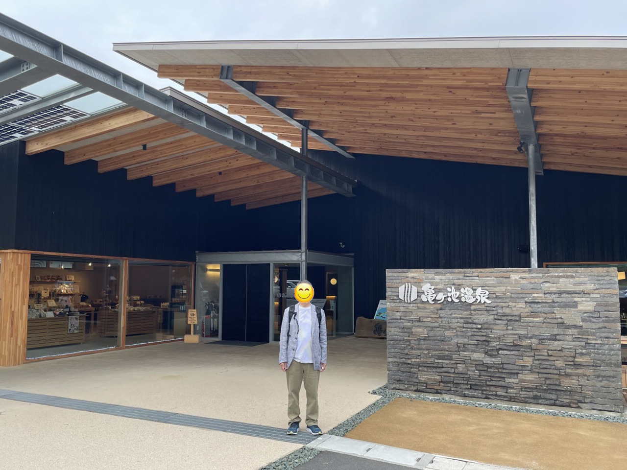 温泉には収容100台を超す広い利用者駐車場と有料の CHAdeMO 30kW EV充電スポットがあり、その東側には公園キャンプ場と海水の湾かと見まごうほど大きな亀ヶ池が広がっています。